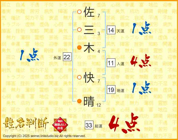 佐(7画)三(3画)木(4画) 快(7画)晴(12画)