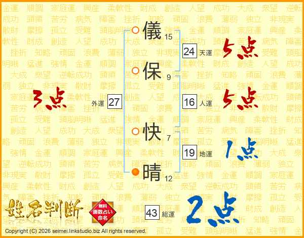 儀保快晴さんの天運は24画の5点!