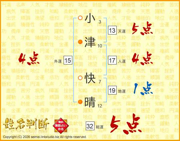 小津快晴さんの総運は32画の5点!