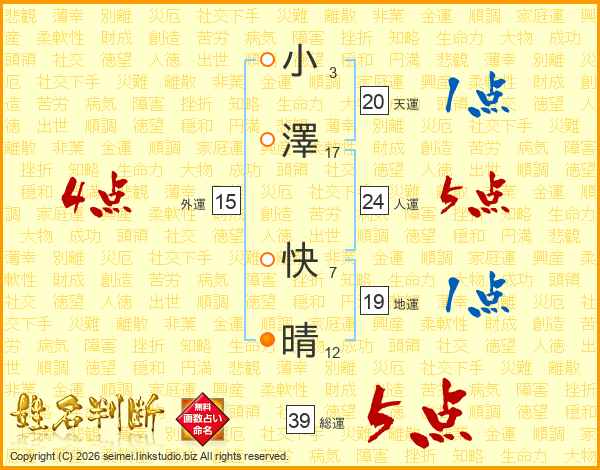 生活面を象徴する運勢です。外部から受ける影響力を表し、結婚運、家庭運や職場、環境への順応性を表します。総運から人運を引いた画数。姓や名が1文字の場合を除く。