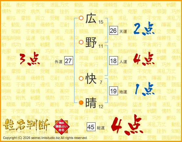 広(15画)野(11画) 快(7画)晴(12画)