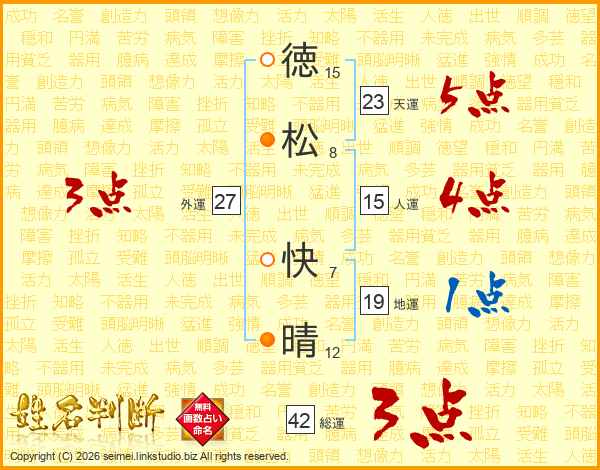 生活面を象徴する運勢です。外部から受ける影響力を表し、結婚運、家庭運や職場、環境への順応性を表します。総運から人運を引いた画数。姓や名が1文字の場合を除く。