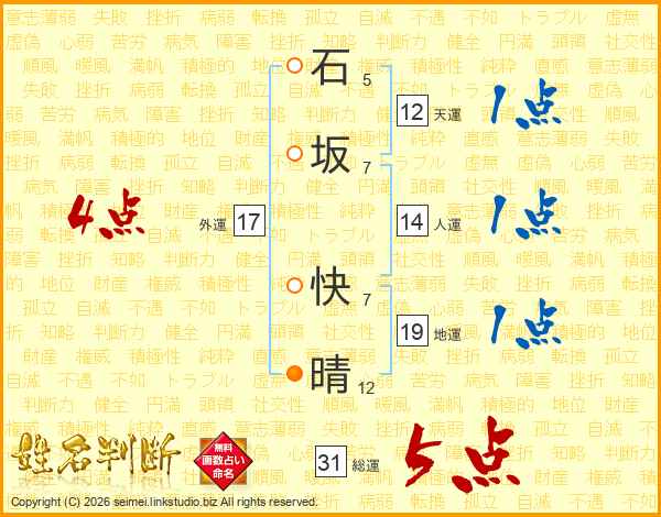 石坂快晴さんの総運は31画の5点!