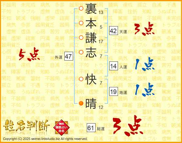 裏(13画)本(5画)謙(17画)志(7画) 快(7画)晴(12画)