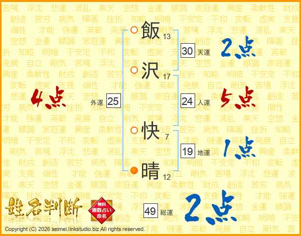 飯(13画)沢(17画) 快(7画)晴(12画)