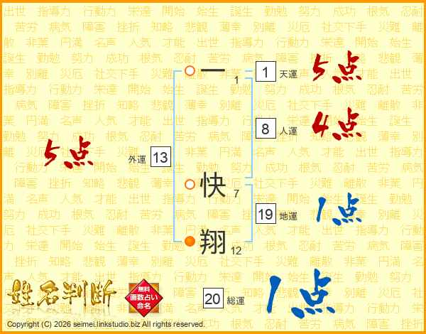 生活面を象徴する運勢です。外部から受ける影響力を表し、結婚運、家庭運や職場、環境への順応性を表します。総運から人運を引いた画数。姓や名が1文字の場合を除く。