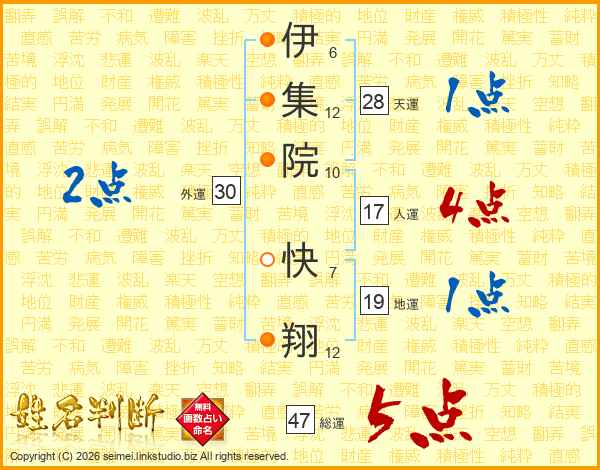 伊(6画)集(12画)院(10画) 快(7画)翔(12画)