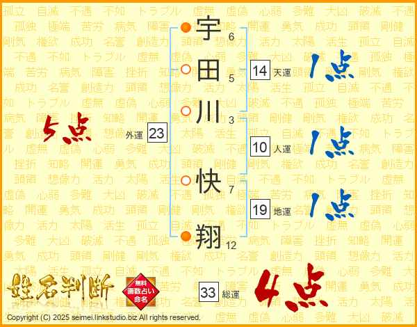 宇(6画)田(5画)川(3画) 快(7画)翔(12画)