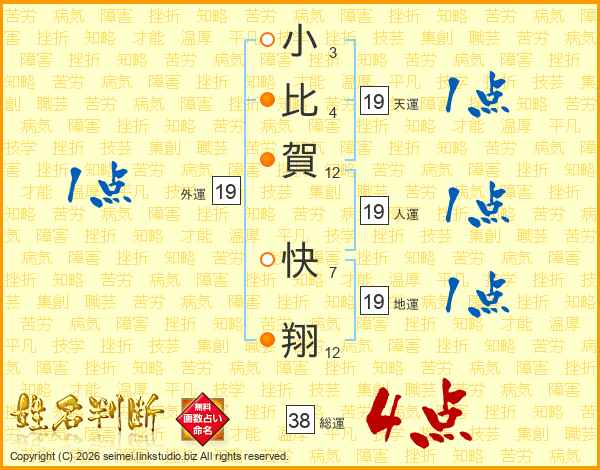 小(3画)比(4画)賀(12画) 快(7画)翔(12画)