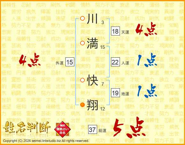 生活面を象徴する運勢です。外部から受ける影響力を表し、結婚運、家庭運や職場、環境への順応性を表します。総運から人運を引いた画数。姓や名が1文字の場合を除く。