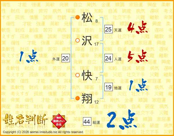 松(8画)沢(17画) 快(7画)翔(12画)