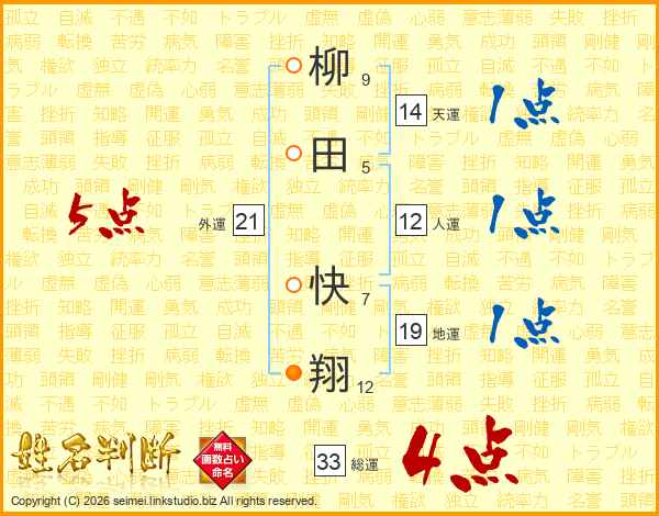 生活面を象徴する運勢です。外部から受ける影響力を表し、結婚運、家庭運や職場、環境への順応性を表します。総運から人運を引いた画数。姓や名が1文字の場合を除く。