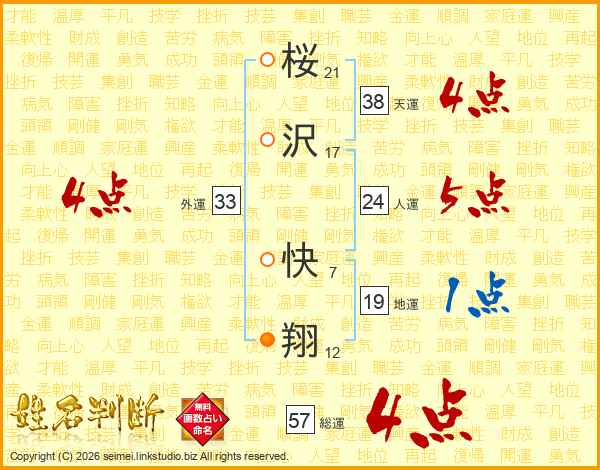 桜(21画)沢(17画) 快(7画)翔(12画)