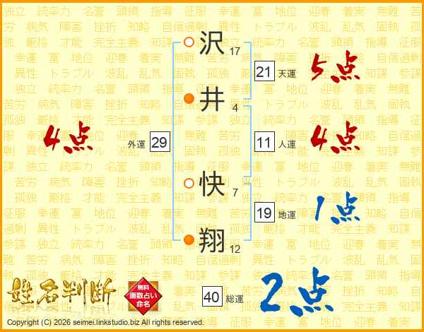 沢(17画)井(4画) 快(7画)翔(12画)