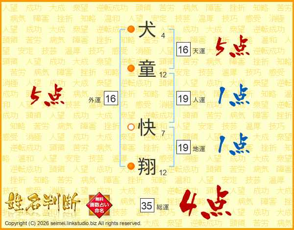 犬(4画)童(12画) 快(7画)翔(12画)