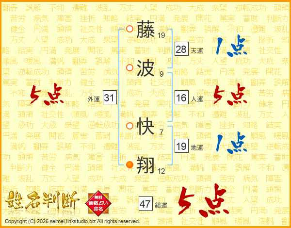 藤(19画)波(9画) 快(7画)翔(12画)