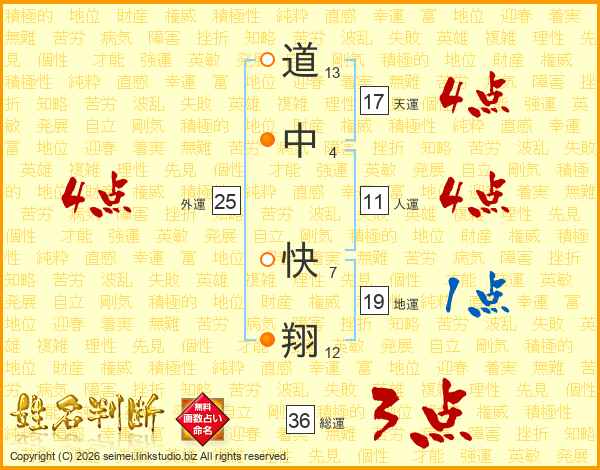 道中快翔さんの天運は17画の4点!