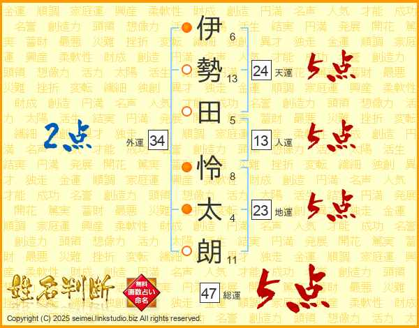 伊(6画)勢(13画)田(5画) 怜(8画)太(4画)朗(11画)
