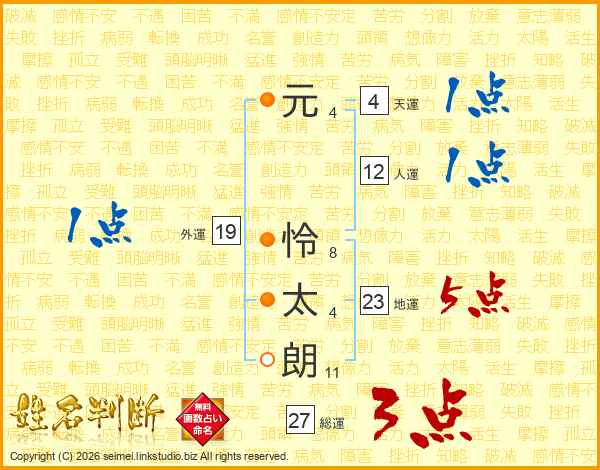 元(4画) 怜(8画)太(4画)朗(11画)
