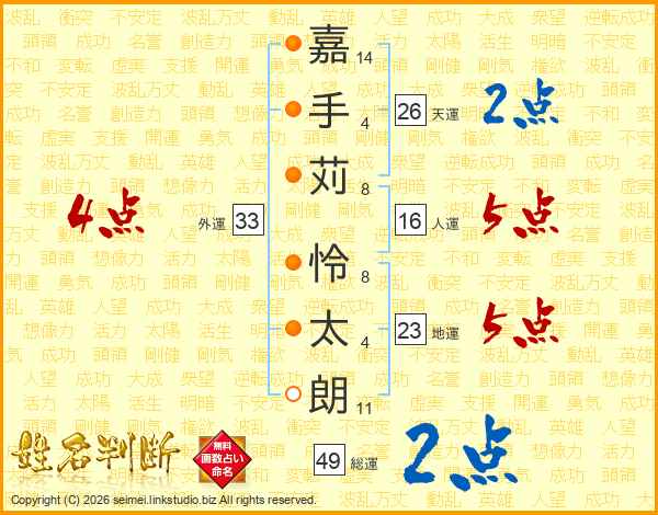 嘉手苅怜太朗さんの天運は26画の2点!