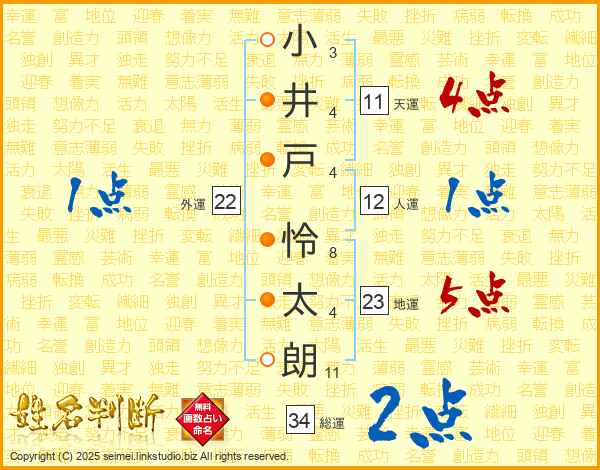 小(3画)井(4画)戸(4画) 怜(8画)太(4画)朗(11画)