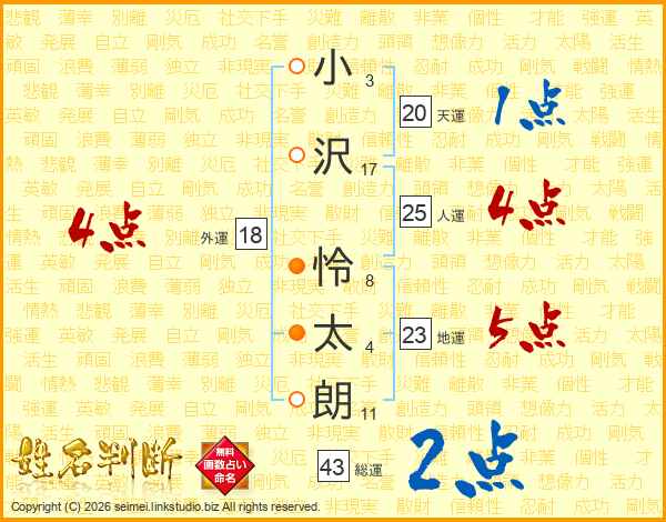 小(3画)沢(17画) 怜(8画)太(4画)朗(11画)