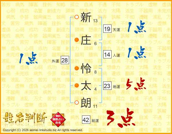 新(13画)庄(6画) 怜(8画)太(4画)朗(11画)