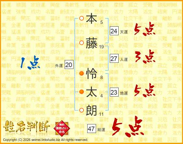 本(5画)藤(19画) 怜(8画)太(4画)朗(11画)