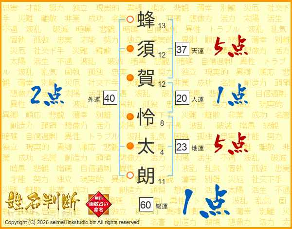 蜂(13画)須(12画)賀(12画) 怜(8画)太(4画)朗(11画)