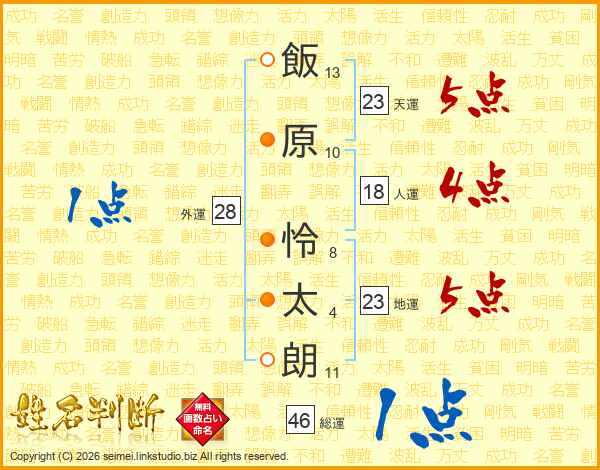 飯(13画)原(10画) 怜(8画)太(4画)朗(11画)