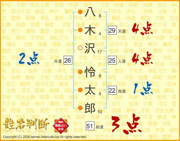 八(8画)木(4画)沢(17画) 怜(8画)太(4画)郎(10画)