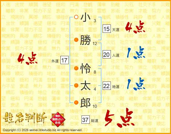 小(3画)勝(12画) 怜(8画)太(4画)郎(10画)