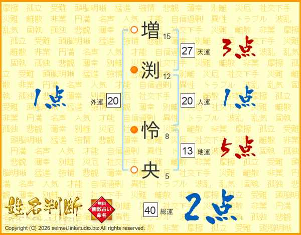 増(15画)渕(12画) 怜(8画)央(5画)