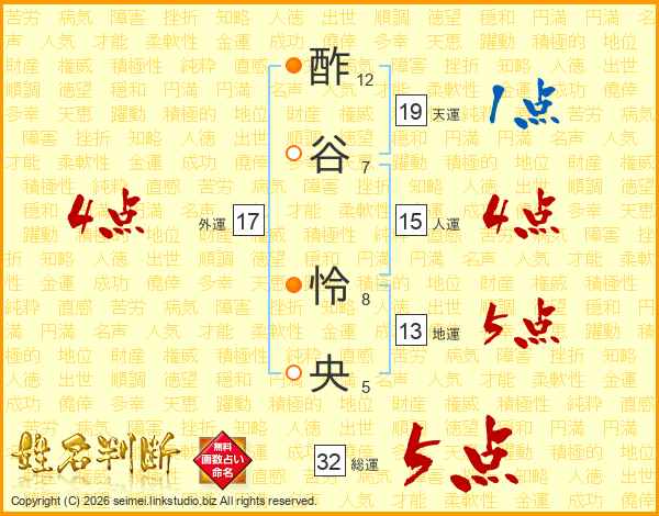 生活面を象徴する運勢です。外部から受ける影響力を表し、結婚運、家庭運や職場、環境への順応性を表します。総運から人運を引いた画数。姓や名が1文字の場合を除く。