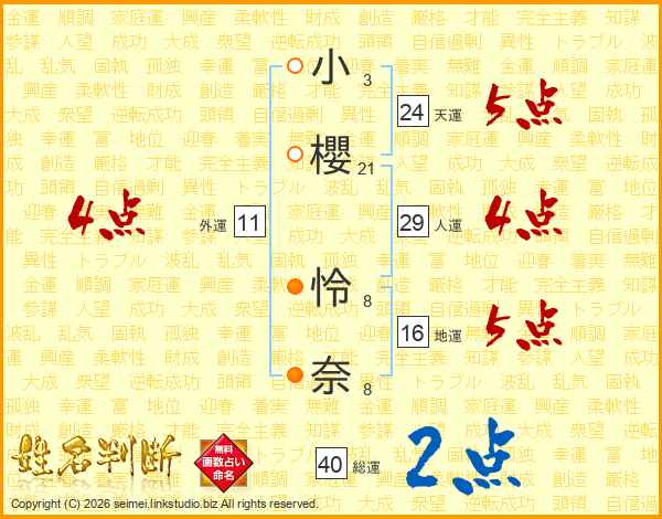 小(3画)櫻(21画) 怜(8画)奈(8画)