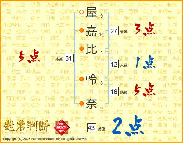 屋(9画)嘉(14画)比(4画) 怜(8画)奈(8画)