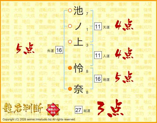 池(7画)ノ(1画)上(3画) 怜(8画)奈(8画)