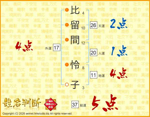 比(4画)留(10画)間(12画) 怜(8画)子(3画)
