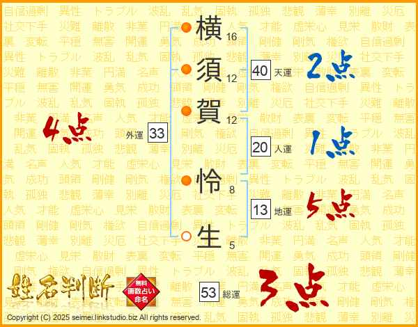 横(16画)須(12画)賀(12画) 怜(8画)生(5画)