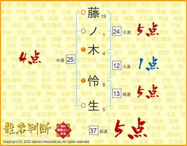 藤(19画)ノ(1画)木(4画) 怜(8画)生(5画)