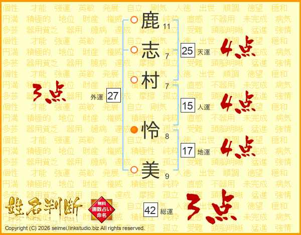 鹿(11画)志(7画)村(7画) 怜(8画)美(9画)