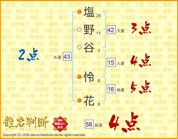塩(24画)野(11画)谷(7画) 怜(8画)花(8画)
