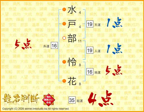 水(4画)戸(4画)部(11画) 怜(8画)花(8画)