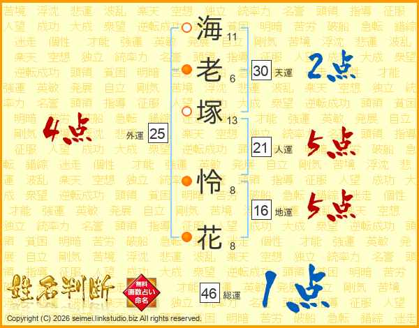 海(11画)老(6画)塚(13画) 怜(8画)花(8画)