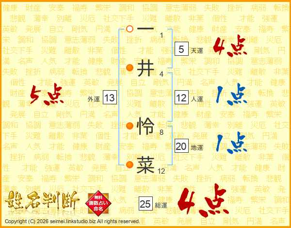 一(1画)井(4画) 怜(8画)菜(12画)