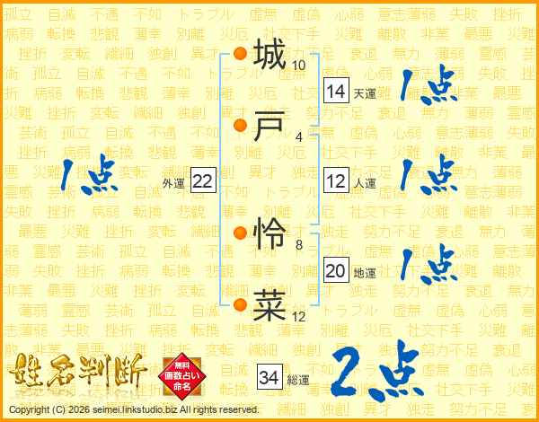城(10画)戸(4画) 怜(8画)菜(12画)