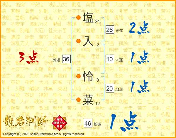 塩(24画)入(2画) 怜(8画)菜(12画)