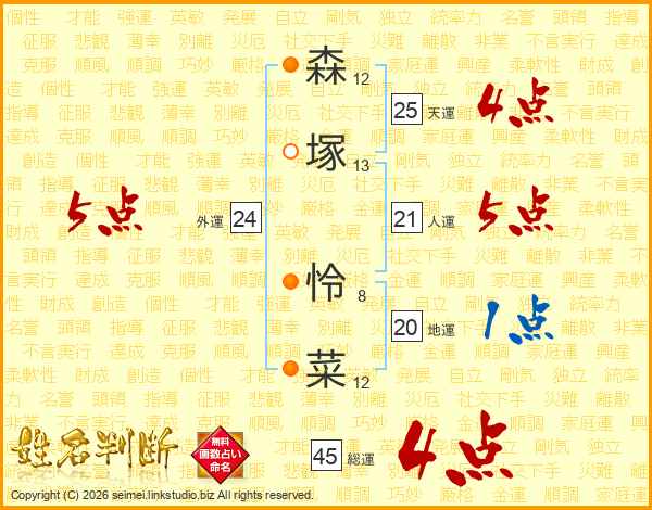 森(12画)塚(13画) 怜(8画)菜(12画)
