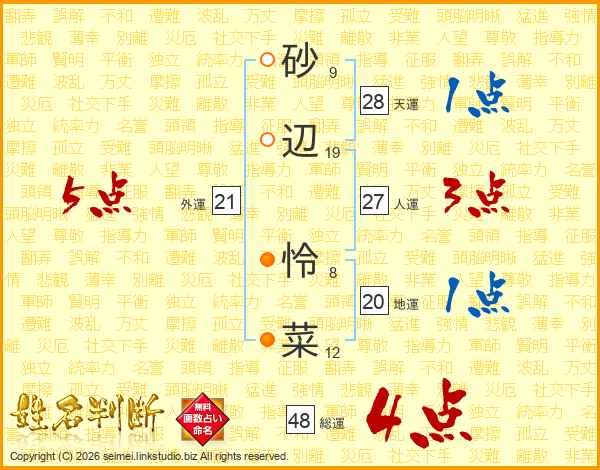 砂(9画)辺(19画) 怜(8画)菜(12画)