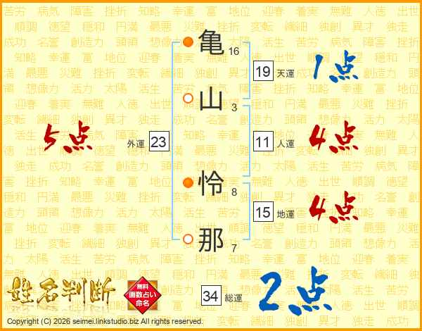 亀(16画)山(3画) 怜(8画)那(7画)